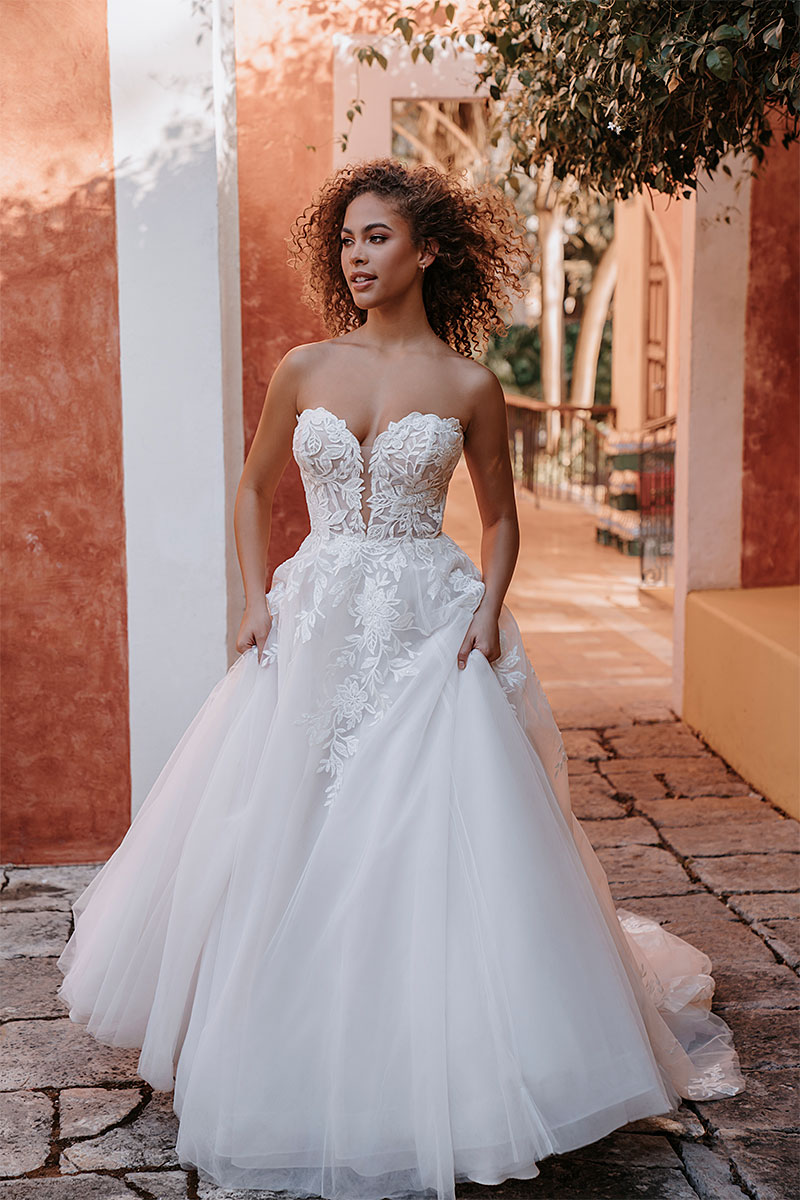 This strapless ballgown features a deep sweetheart neckline to striking effect.