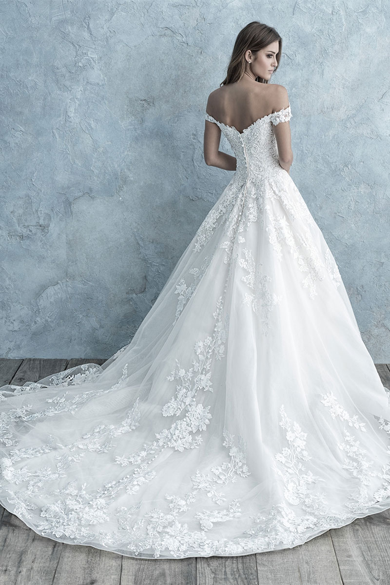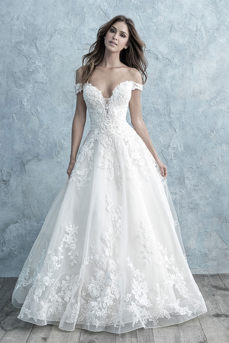 This elegant ballgown embodies all things romantic, featuring off-shoulder sleeves and lace galore.