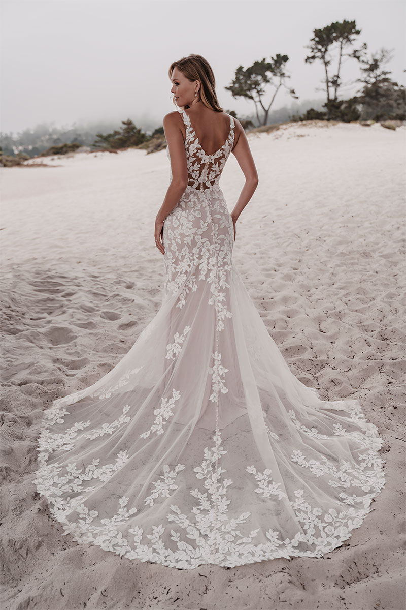Romantic floral motifs train the bodice and train of this sleeveless gown.