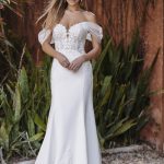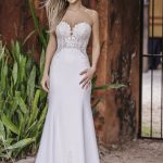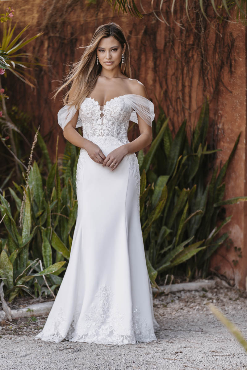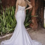 A figure-skimming crepe composes the skirt and train of this lovely strapless number.