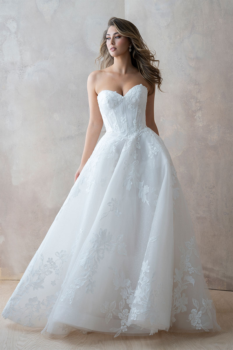 Elegant lace appliques give dimension to the sparkling tulle overlay of the Babetta ballgown, which features a strapless, sweetheart bodice and basque waist.