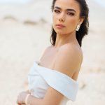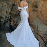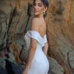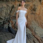The F348 Peony gown is composed of dreamy draped crepe and accented by an off-shoulder strap. This gown is both playful and gentle. It will look as beautiful during your elegant walk down the aisle as it does when dancing to your favorite songs at the reception