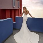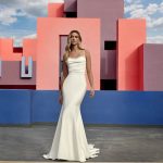 The Galilea sheath features a gathered crepe bodice, accented by a softly scrooped crystal and pearl-encrusted neckline.