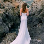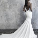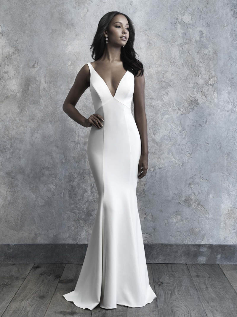 This crepe sheath is all about the lines, subtly definining the empire waist and statement train.