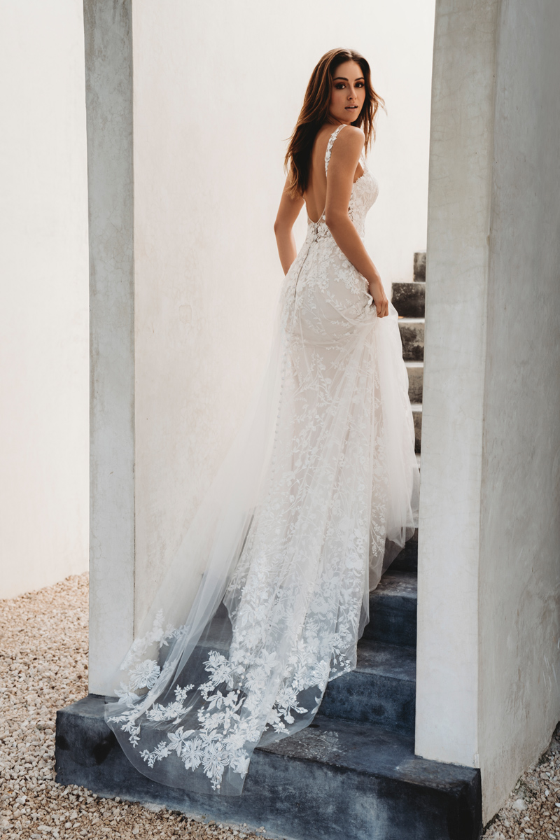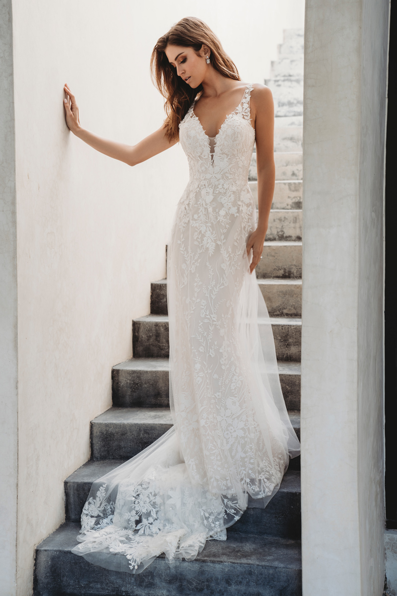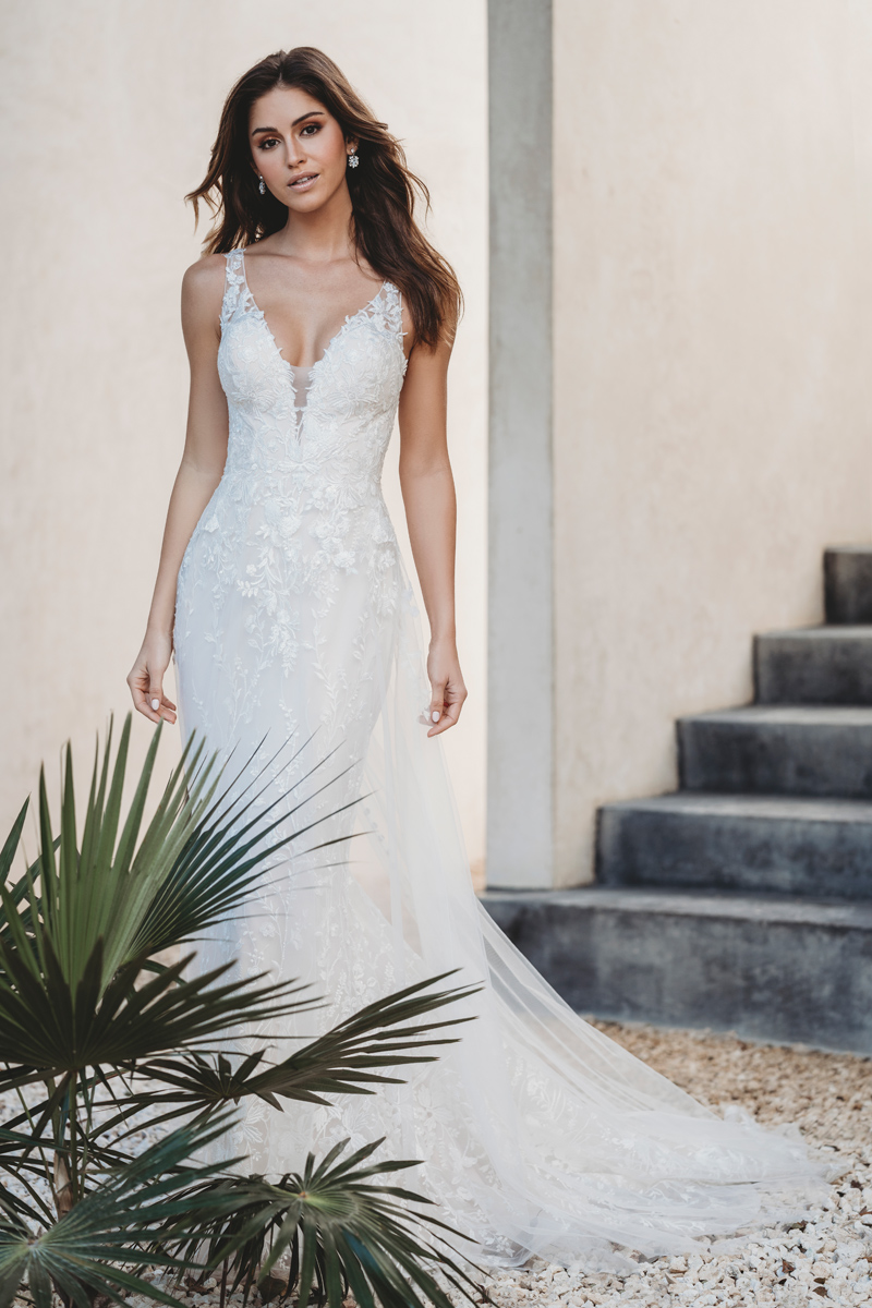 A sheer layer of tulle creates the illusion of an A-line skirt overlay against a sheath gown.