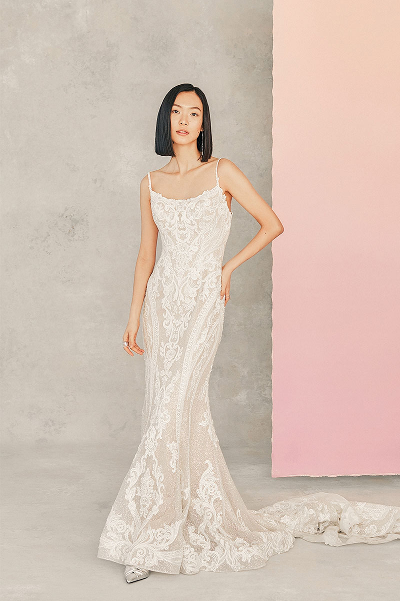 Magical in every light, this sparkle tulle sheath is embellished with intricately beaded lace appliqués.
