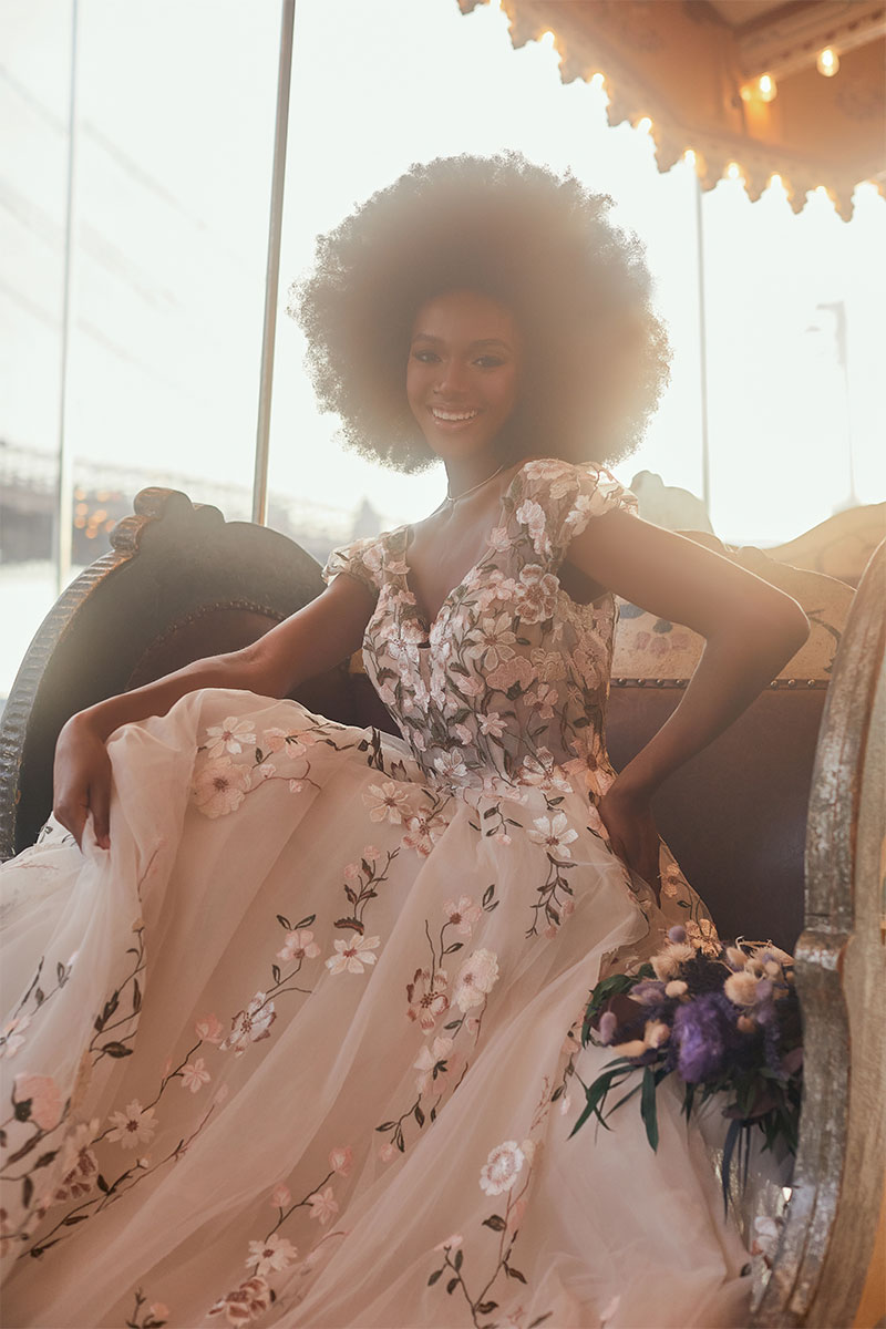 All the romance of realistic blossoms and trailing vines are embodied in our Madison James Johnny Gown – perfect for a secret garden wedding. Magical floral motifs decorate the sheer bodice and flow down the skirt of the MJ900 Johnny dress, covering you in a cascade of flowers. The charming combination of an A-line silhouette and flowery cap sleeves delivers a light and sophisticated look for your special day.