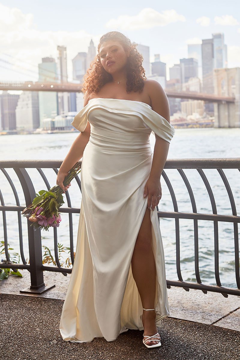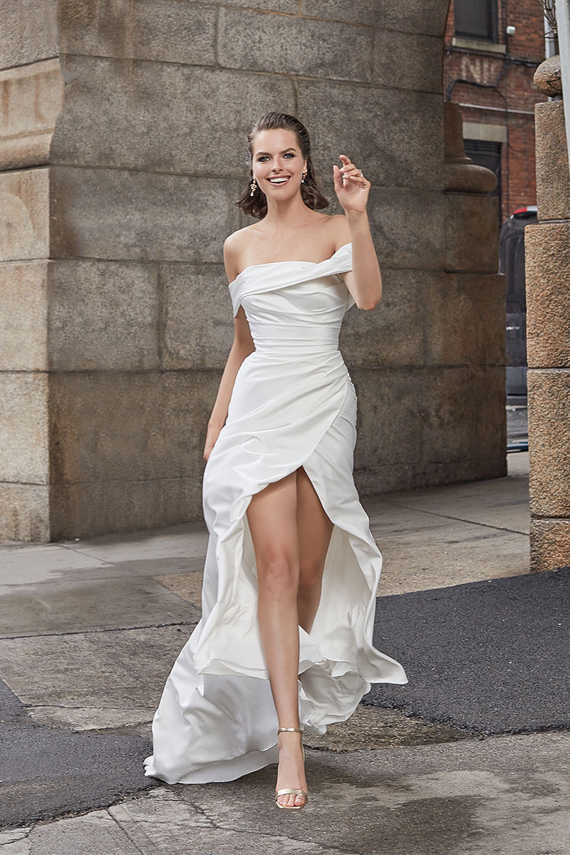 Luxurious stretch satin, tucked and ruched in all the right places and artfully draped off the shoulder, makes our Jade gown absolutely perfect for the glamorous and classic bride.