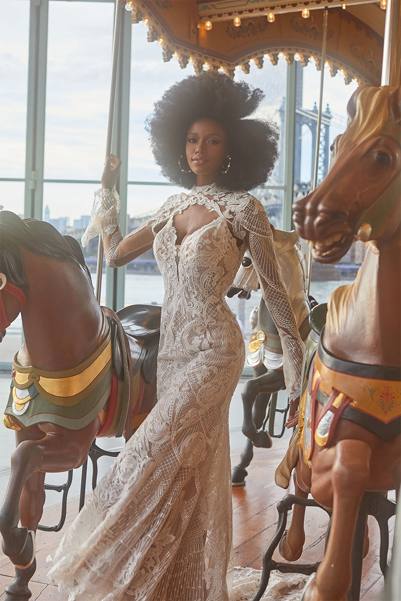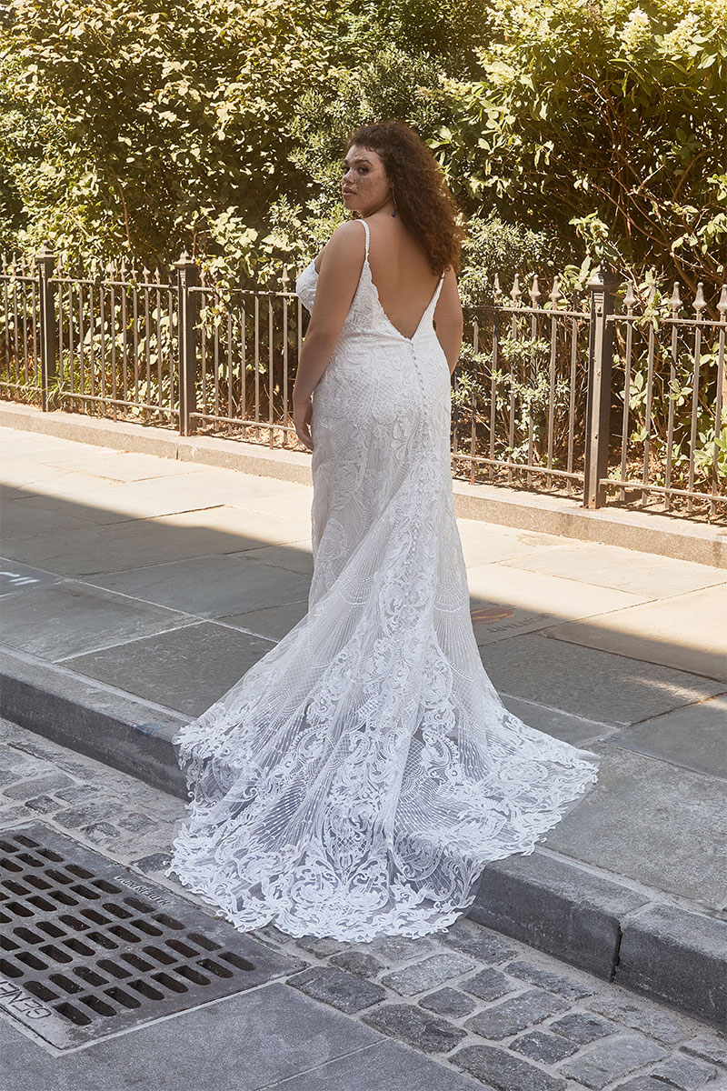 Jones is a beautifully sequined and embroidered appliquéd gown, finished with a removable lace jacket.