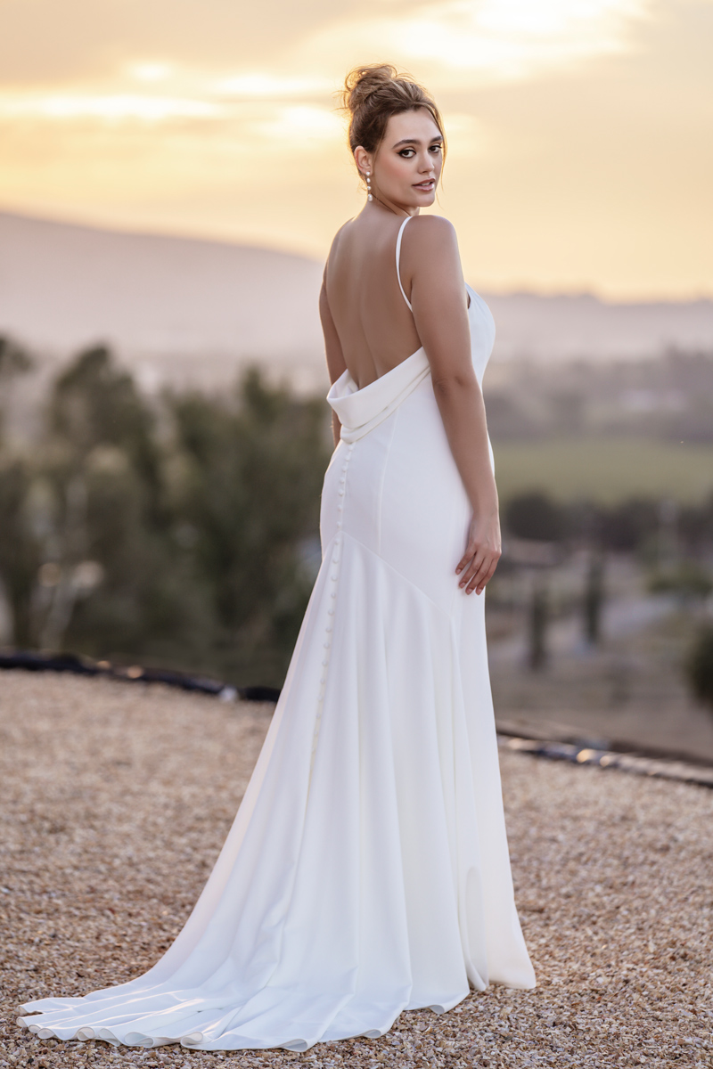 An elegant cowl softens the open back of this chicly minimalist crepe sheath gown.