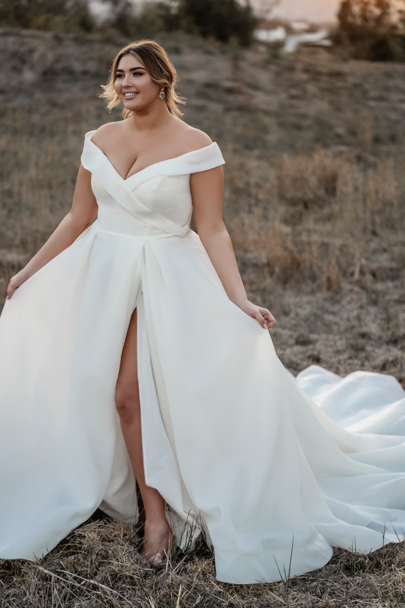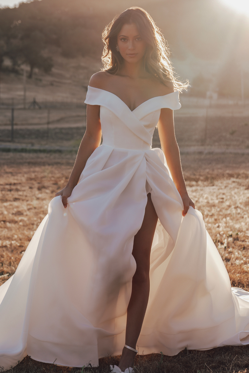 Crisp, architectural organza softly pleats and tucks along the waist and bodice of this romantic off shoulder gown.