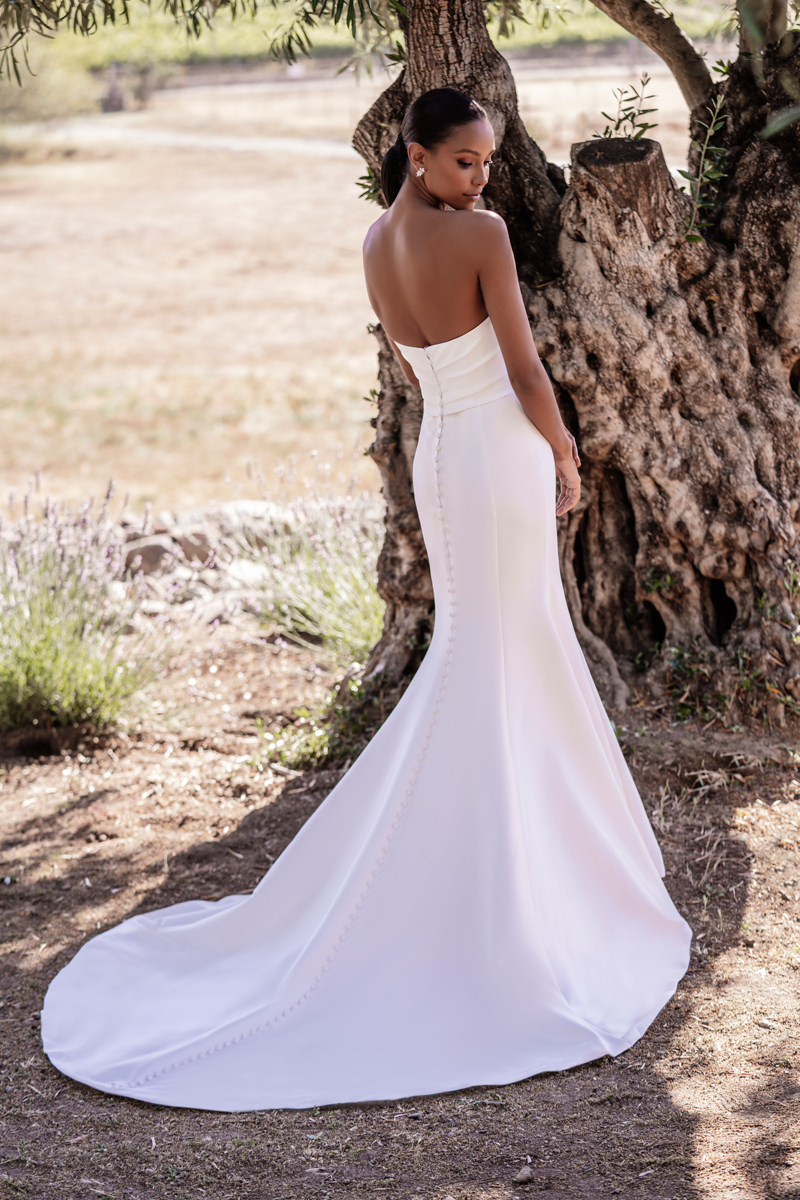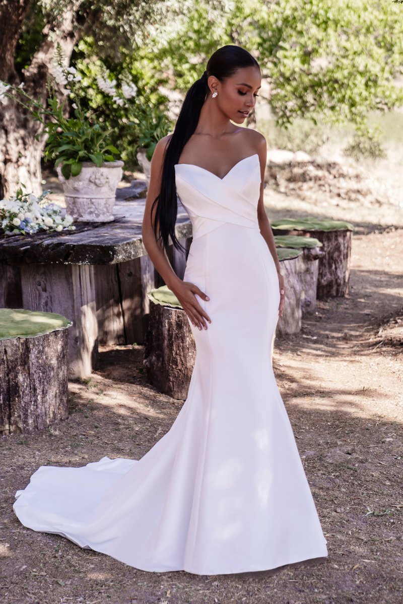 The pearlescent sheen of stretch Mikado is the perfect backdrop for this strapless gown’s statuesque sheath silhouette.