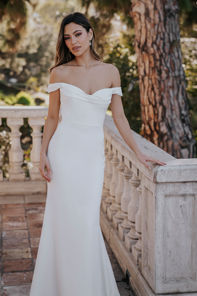 Stretch crepe composes this subtly pleated gown’s beautifully minimalist sheath silhouette.