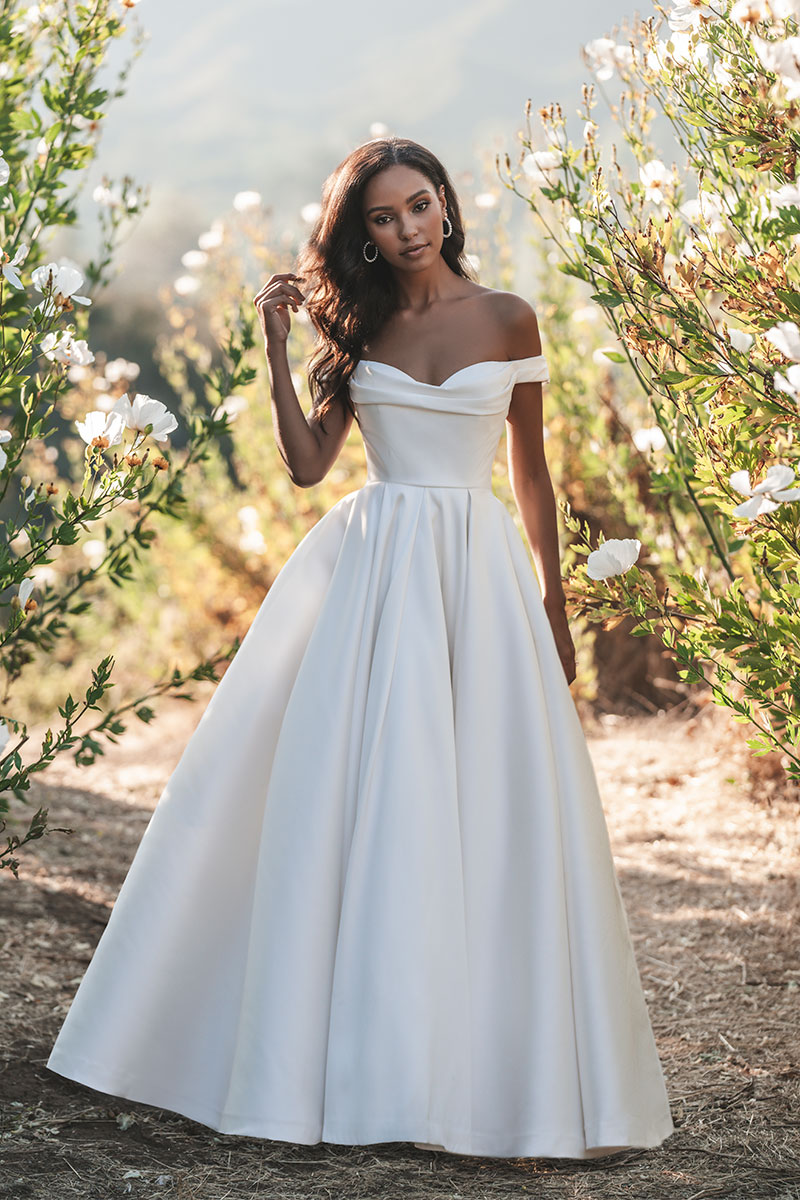 A subtle cowl effect softens the elegant off-shoulder bodice of this Mikado bridal ballgown.