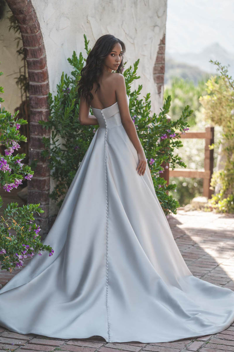 Misty and ethereal in the soft, gray-green hue of Sea Glass, this strapless Mikado ballgown is effortlessly stunning.