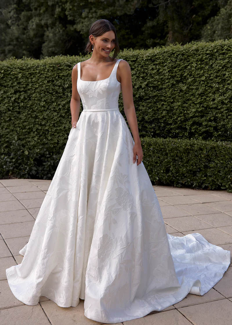 Meet Mahogany, your modern classic. Crafted from luxurious Jacquard Satin, available in Ivory & Vintage White, it’s the epitome of timeless elegance. The square neckline and wide-set straps provide both style and support. Adorned with floral Jacquard satin fabric, Mahogany exudes sophistication. With built-in bra cups, boning, and soft fusing, the bodice ensures a flawless fit. Complete with an invisible zip and full back button closure, this floor-length A-line silhouette is designed for effortless grace. Mahogany is your perfect blend of tradition and modernity.