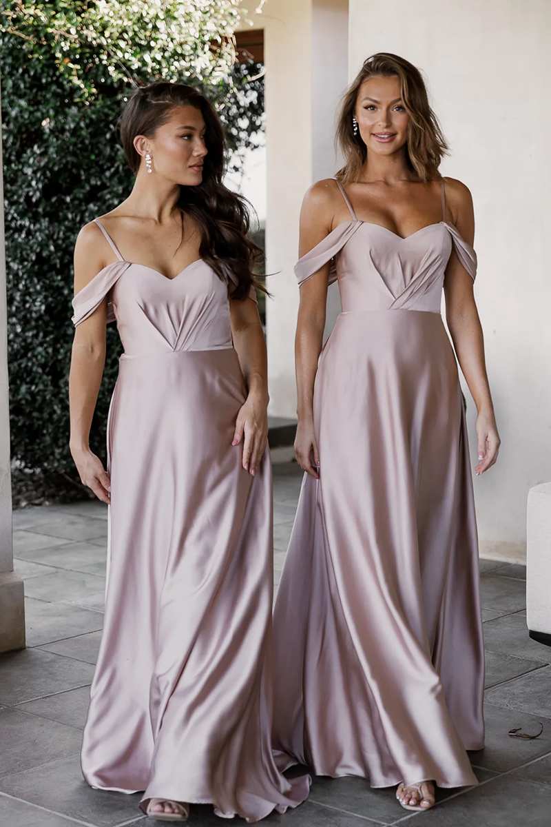 The Odette TO896 Bridesmaid Dress by Tania Olsen Designs is a sweetheart neckline, off shoulder, floor length, light satin wedding guest gown available in sizes AU 4-30.