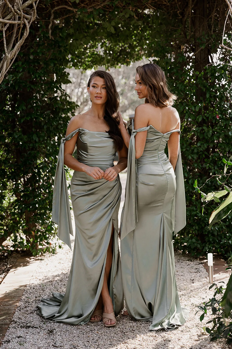 The Esme TO901 Bridesmaid Dress is an off-shoulder cowl, floor length, stretch satin wedding guest gown available in sizes AU 4-30.